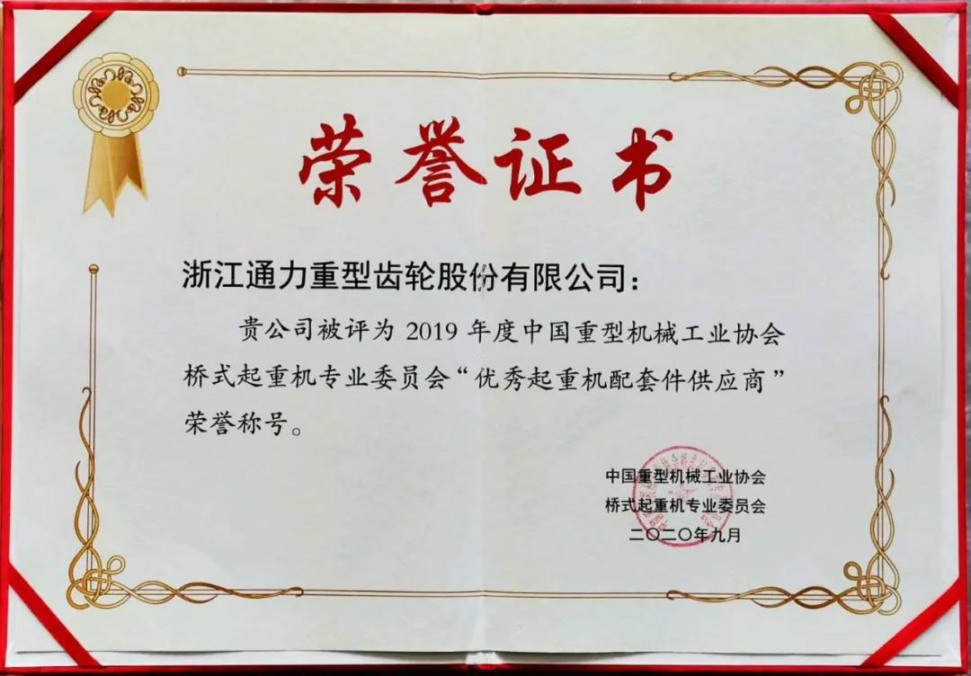 近日,通力收到了一份中國(guó)重型機(jī)械工業(yè)協(xié)會(huì)橋式起重機(jī)專(zhuān)業(yè)委員會(huì)頒發(fā)的榮譽(yù)證書(shū),通力被評(píng)為2019年度中國(guó)重型機(jī)械工業(yè)協(xié)會(huì)橋式起重機(jī)專(zhuān)業(yè)委員會(huì)“優(yōu)秀起重機(jī)配套件供應(yīng)商”的榮譽(yù)稱(chēng)號(hào)。